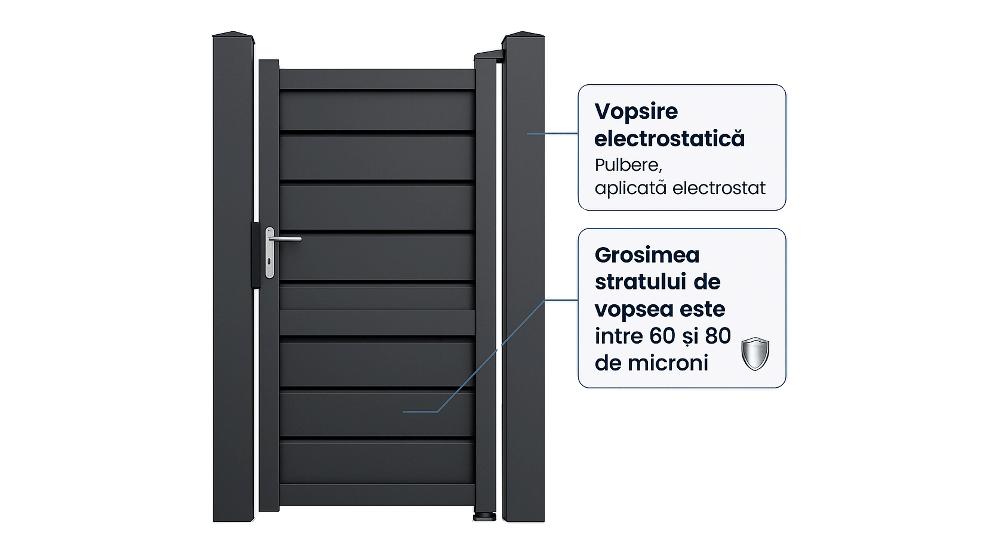 Aceasta poarta pietonala face parte din gama de porti tip jaluzea. Este o poarta pietonala metalica cu lamele reglabile. Prin amplasarea lor, se dozeaza cantitatea de aer care doresti sa patrunda in curtea ta si vei asigura intimitatea gradinii tale, dar tu vei putea sa vezi in exterior.