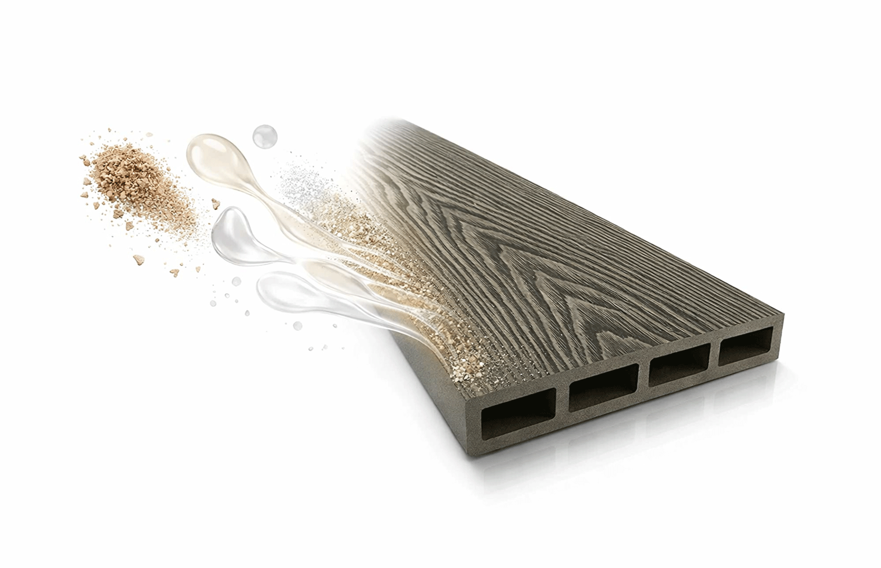 Plăcile WPC sunt realizate dintr-o compoziție echilibrată de 60% fibră lemnoasă, 35% polimeri (HDPE) și 5% aditivi speciali, oferind stabilitate, rezistență și durabilitate în timp. Această combinație asigură atât aspectul natural al lemnului, cât și performanța superioară a materialelor moderne.