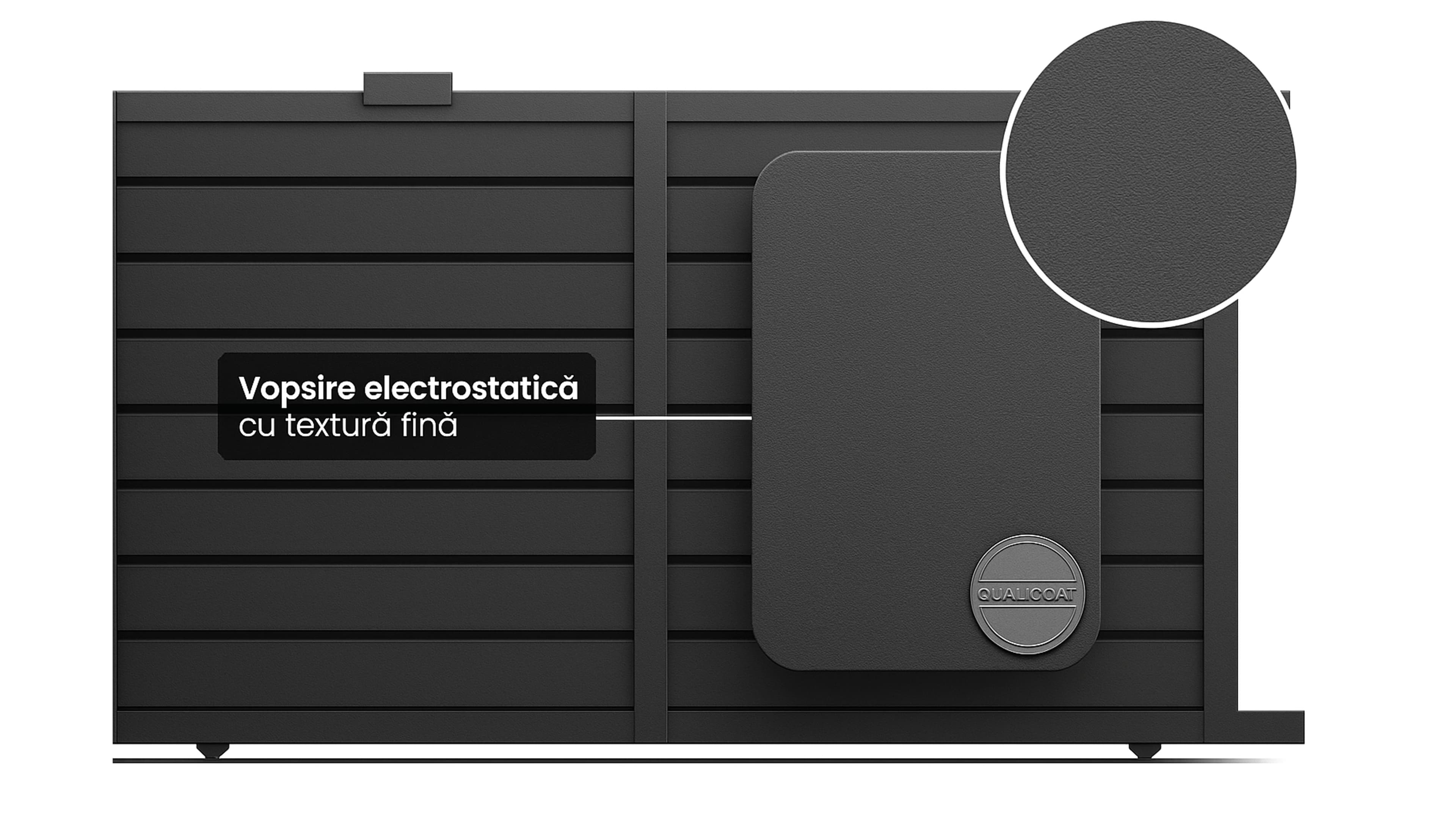 Produsele noastre sunt vopsite prin procedeul de camp electrostatic, care asigură o acoperire uniformă și o textură fină, elegantă. Această metodă este cea mai superioară opțiune pentru vopsirea aluminiului, garantând o rezistență sporită la intemperii, uzură și radiații UV. Vopsirea este certificată Qualicoat, standardul internațional care atestă calitatea și durabilitatea finisajului.