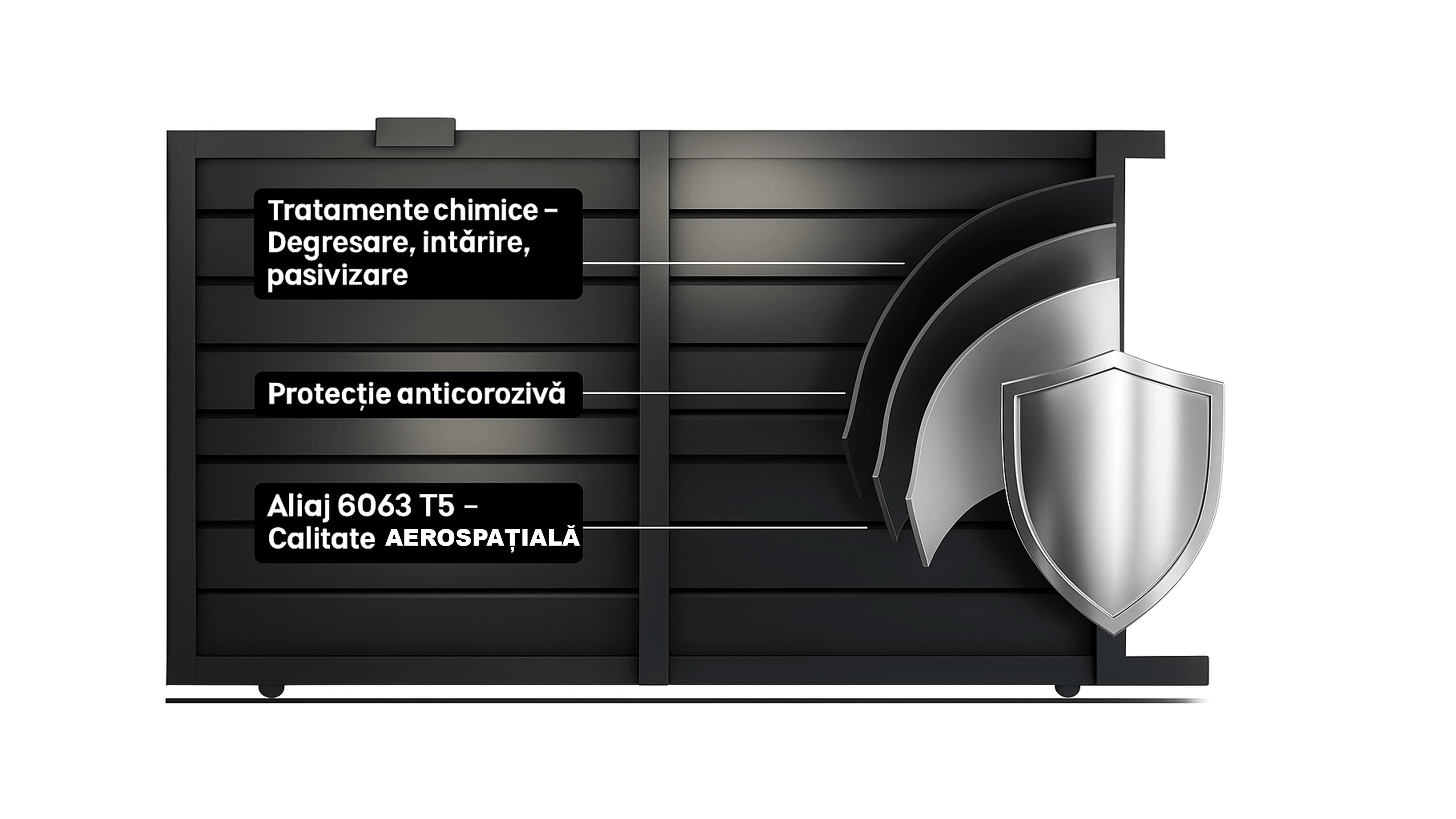Produsul este confecționat din aliajul de aluminiu 6063 T5, recunoscut pentru utilizarea sa în industrie aero-spațială datorită proprietăților sale excepționale. Acest aliaj oferă o combinație optimă între rezistență mecanică și formabilitate, fiind totodată ușor și rezistent la coroziune. Datorită tratamentului termic T5, materialul prezintă o duritate crescută și o stabilitate dimensională excelentă.