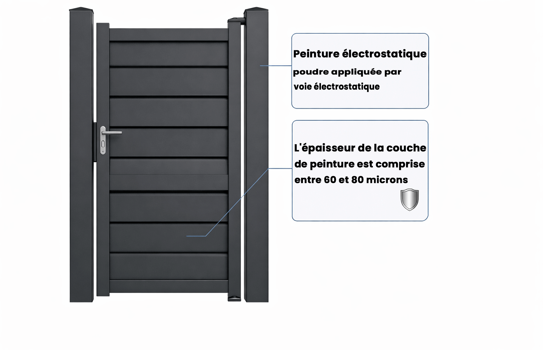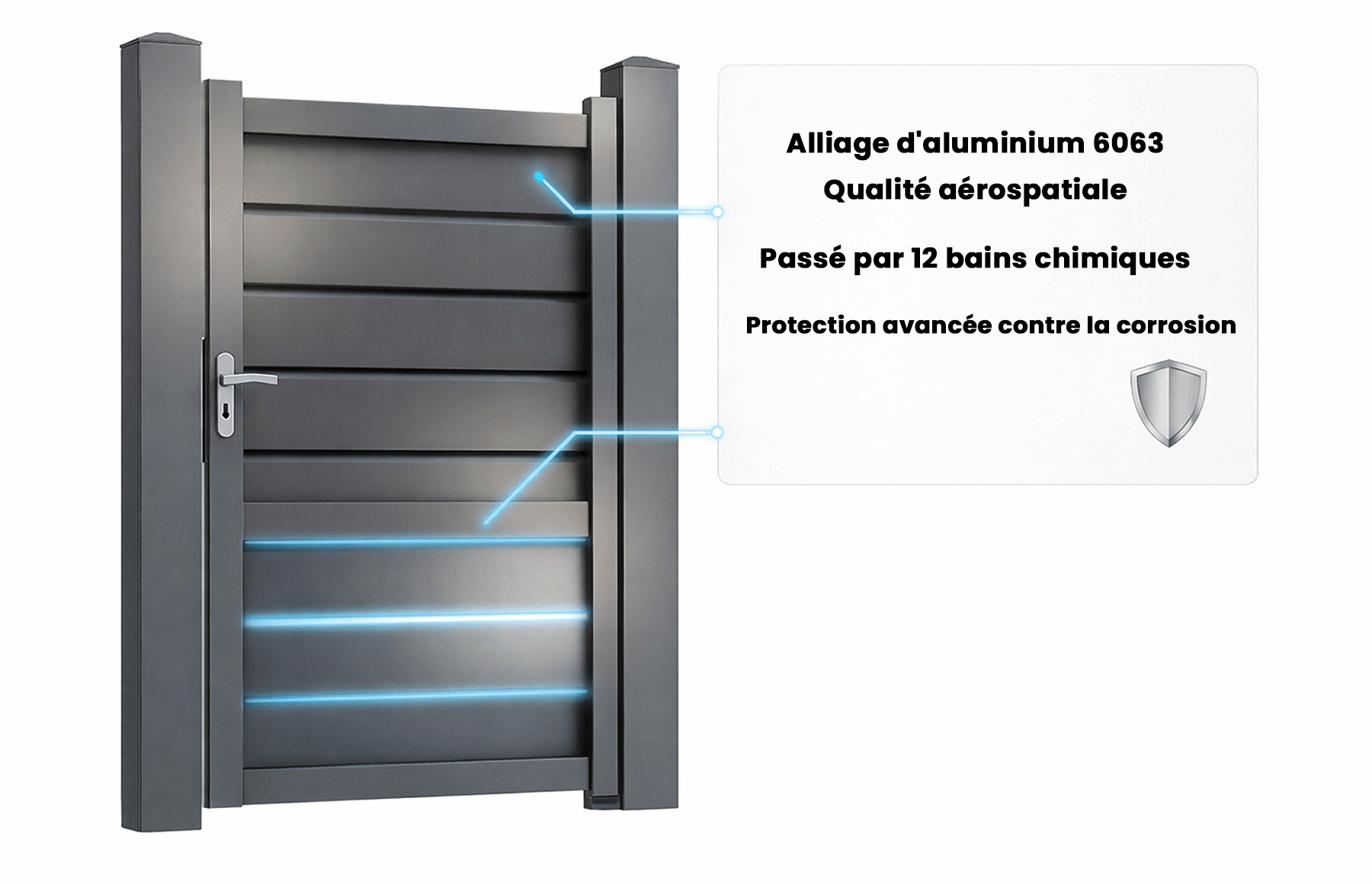 Le portail est fabriqué en alliage d'aluminium 6063 T5 de qualité aérospatiale, traité par 12 bains chimiques successifs, offrant une protection avancée et durable contre la corrosion, quelles que soient les conditions climatiques ou environnementales.