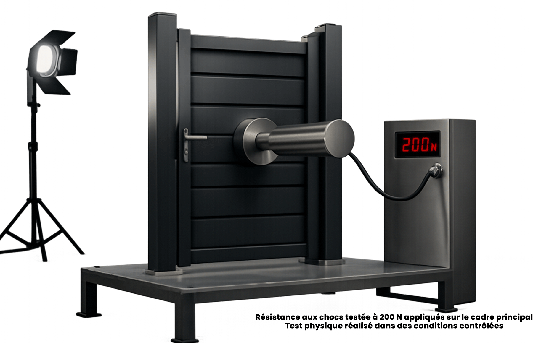 La porte a été soumise à un test physique de résistance, dans des conditions contrôlées, démontrant sa capacité à supporter un impact allant jusqu'à 200 N appliqué directement sur le cadre principal, sans déformation ni altération de la structure. Le résultat confirme la durabilité et la qualité de la construction en aluminium.