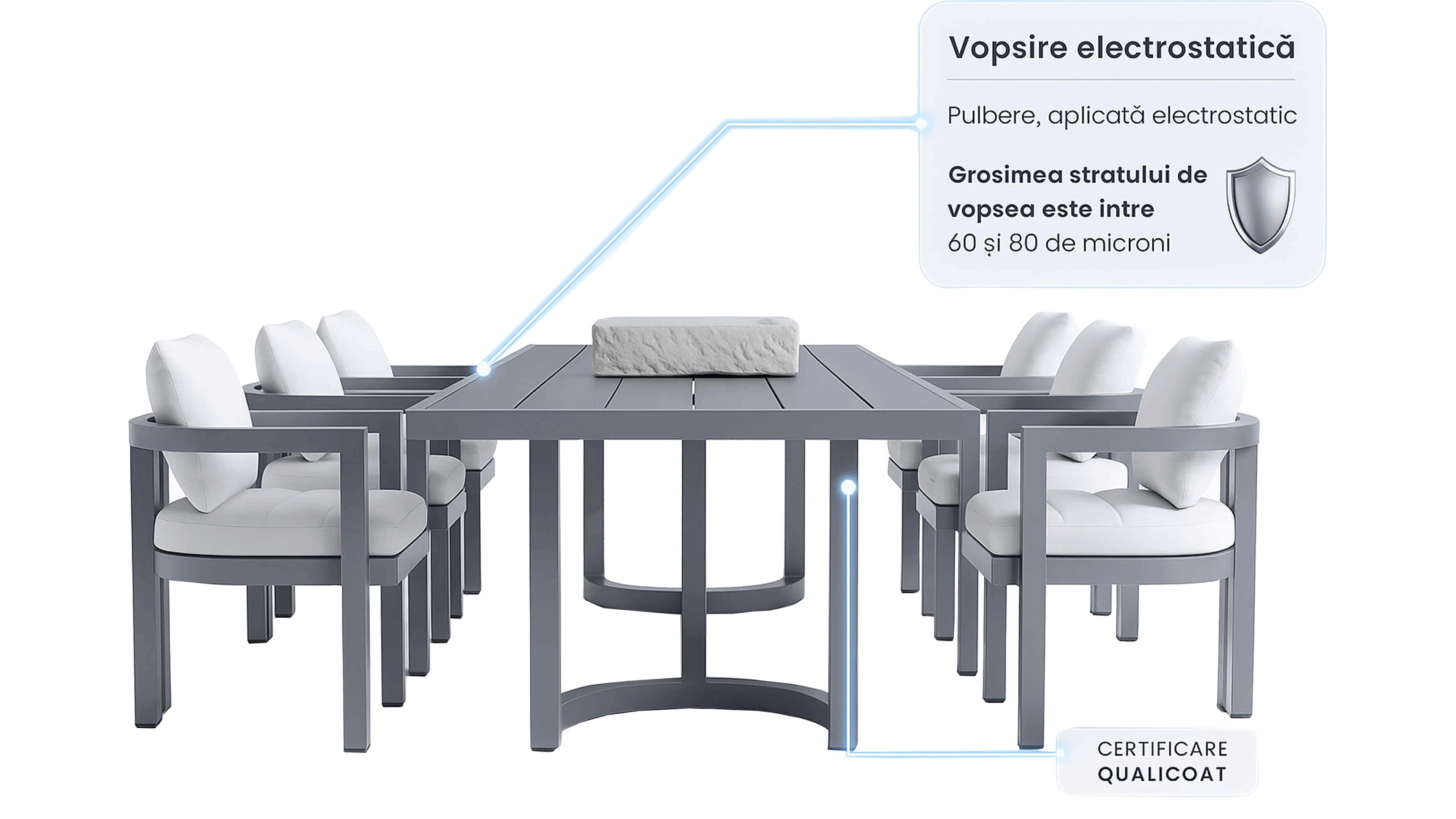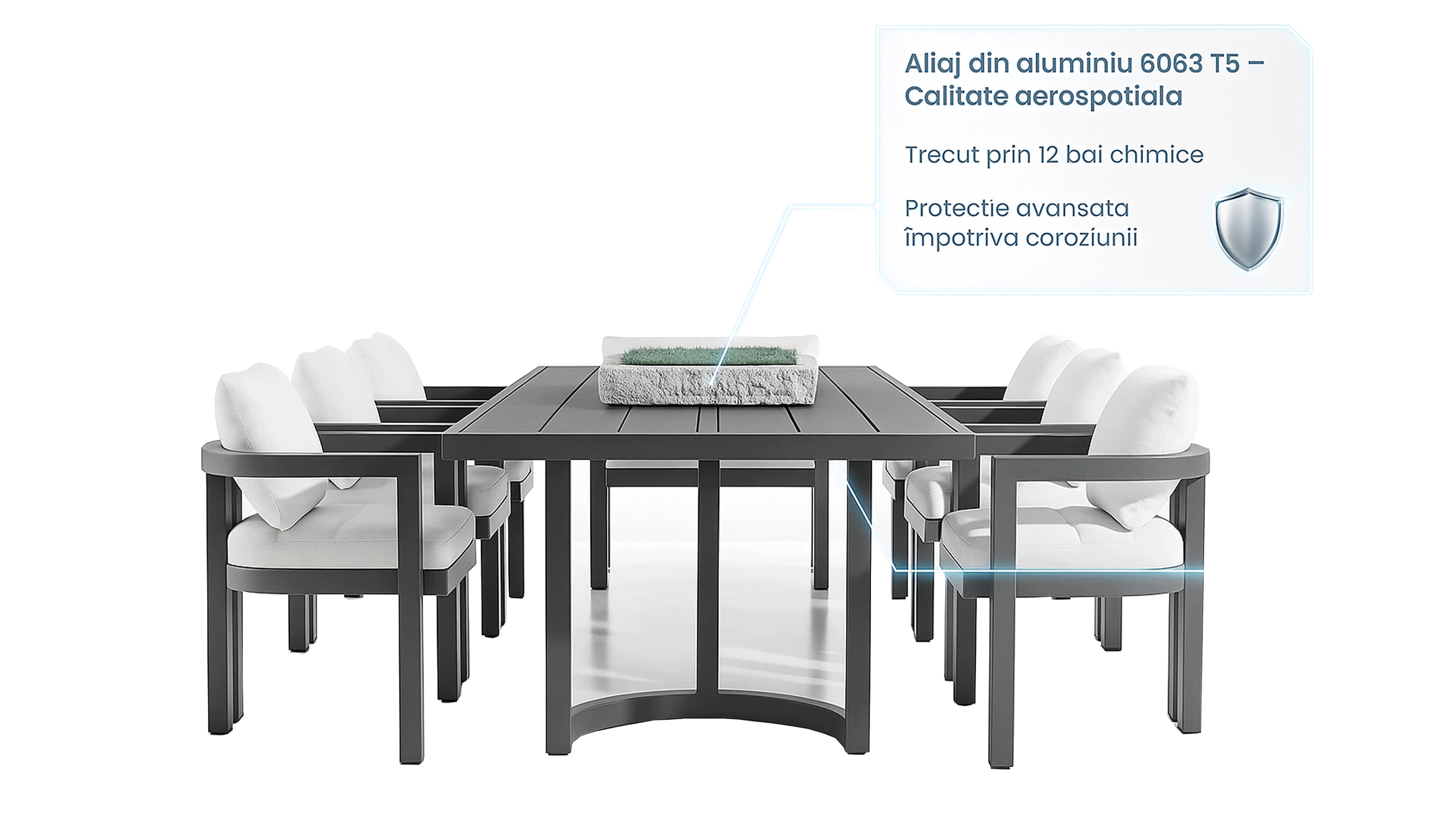 Mesele dining sunt extrem de utile si practice pentru cei ce prefera sa se bucure in aer liber de mancarea preferata. Pastreaza-ti locuinta impecabila, optand pentru acest set de masa si scaune de gradina. O masa cu 6 scaune echipate cu perne a caror husa este rezistenta la umezeala si la efectul nociv al razelor ultraviolete. Fiind confectionat din aluminiu, setul de scaune si masa pentru terasa este usor, astfel vei putea reconfigura mereu gradina ta.