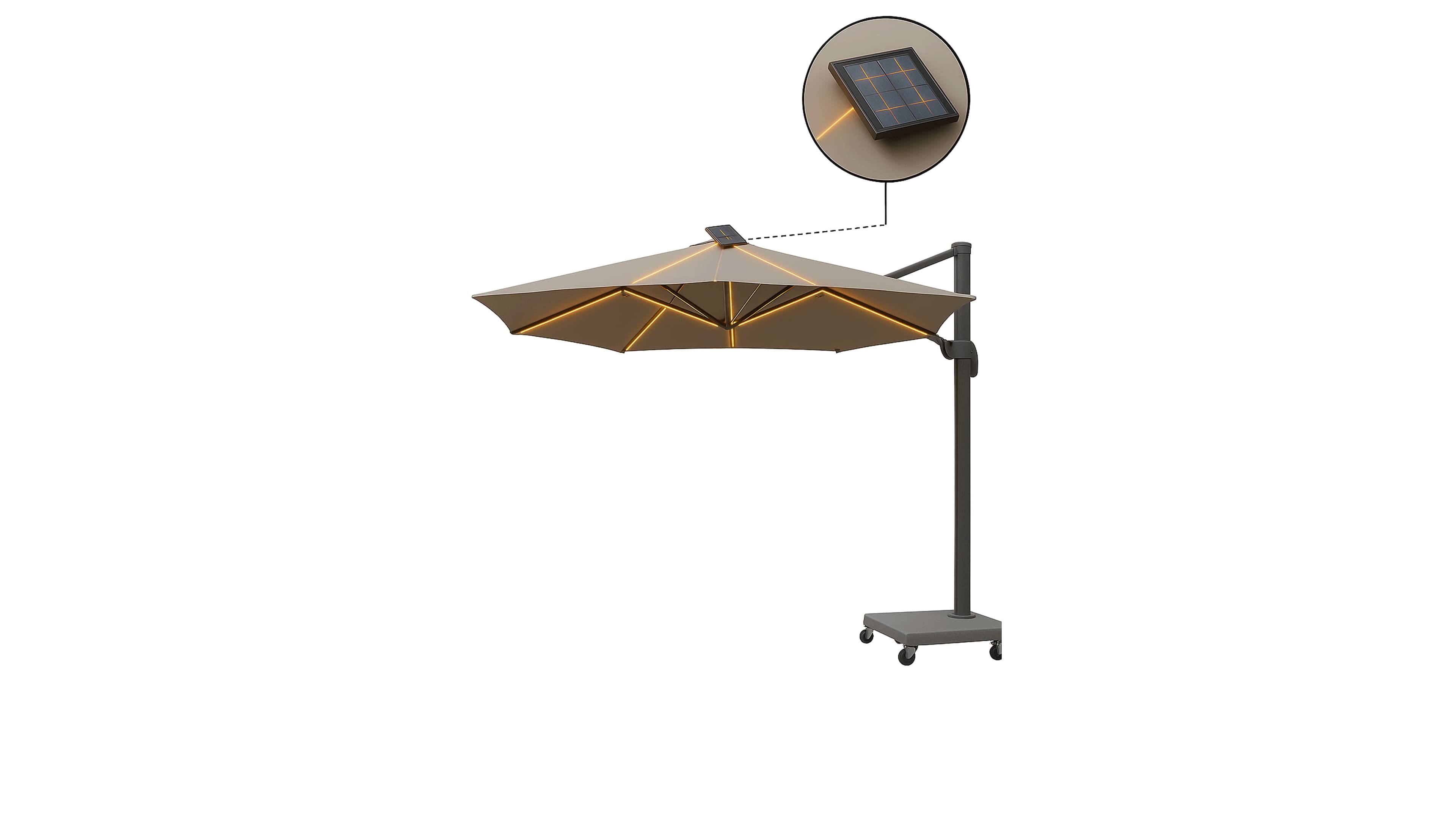 Avem și varianta de umbrelă premium echipată cu sistem de iluminare LED alimentat de un panou solar integrat, poziționat discret în partea superioară. Panoul încarcă bateria pe parcursul zilei, oferind seara o lumină ambientală plăcută și eficientă, fără cabluri sau consum suplimentar de energie electrică.