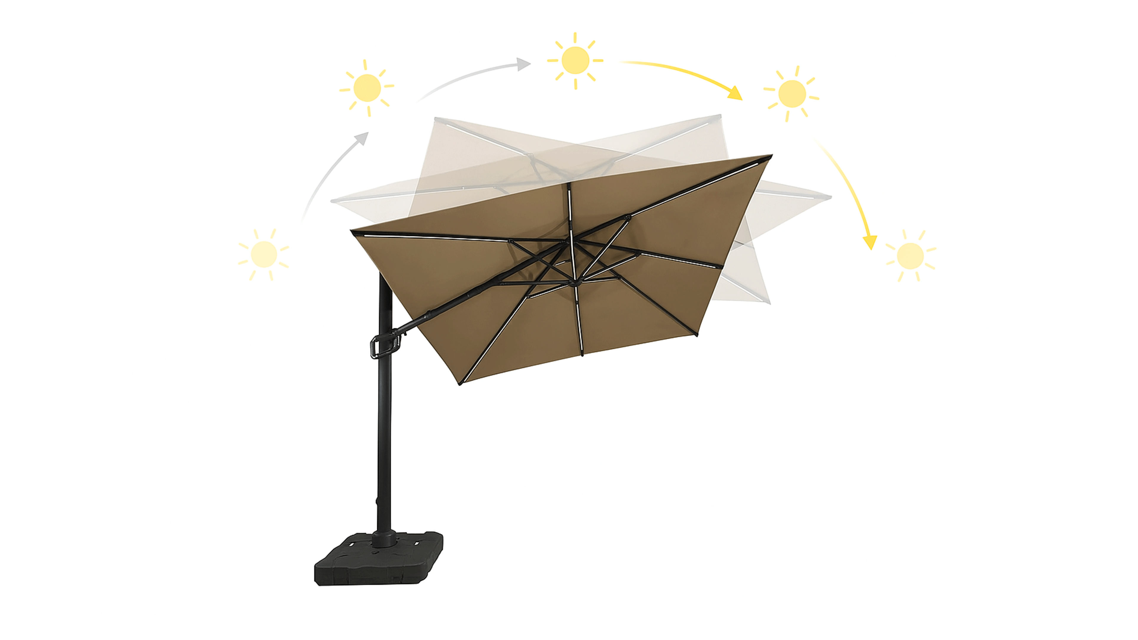 Umbrela premium este dotată cu un mecanism de ajustare care permite rotirea și înclinarea acesteia în funcție de poziția soarelui. Astfel, beneficiați mereu de umbră optimă și protecție eficientă pe tot parcursul zilei, fără a fi nevoie să o mutați din loc.